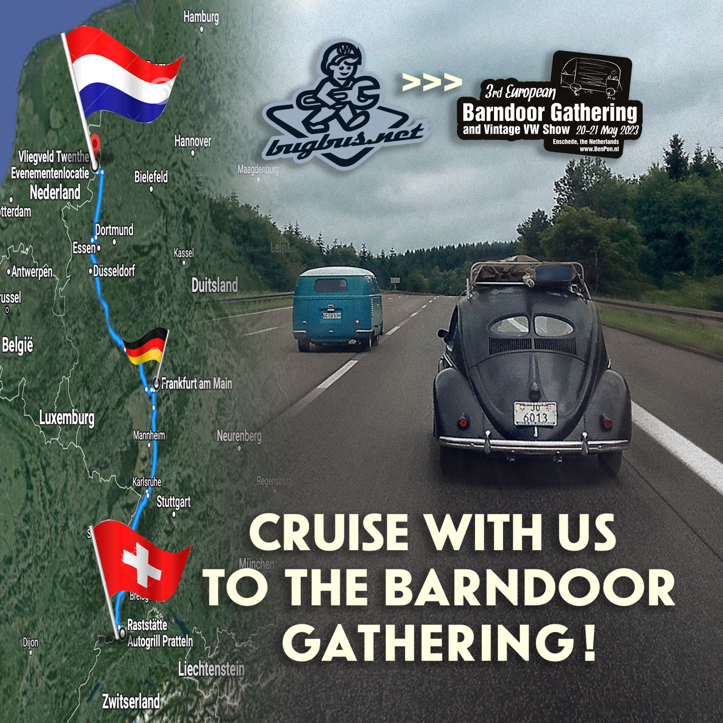 Cruise from CH with bUGbUs.nEt to the 3rd European Barndoor Gathering & Vintage VW Show // Ben Pon Show 2023! Another cool roll out to the Ben Pon Show coming from Switzerland, we can’t wait to welcome you all there. Thanks Claude Schaub for the support to the show!